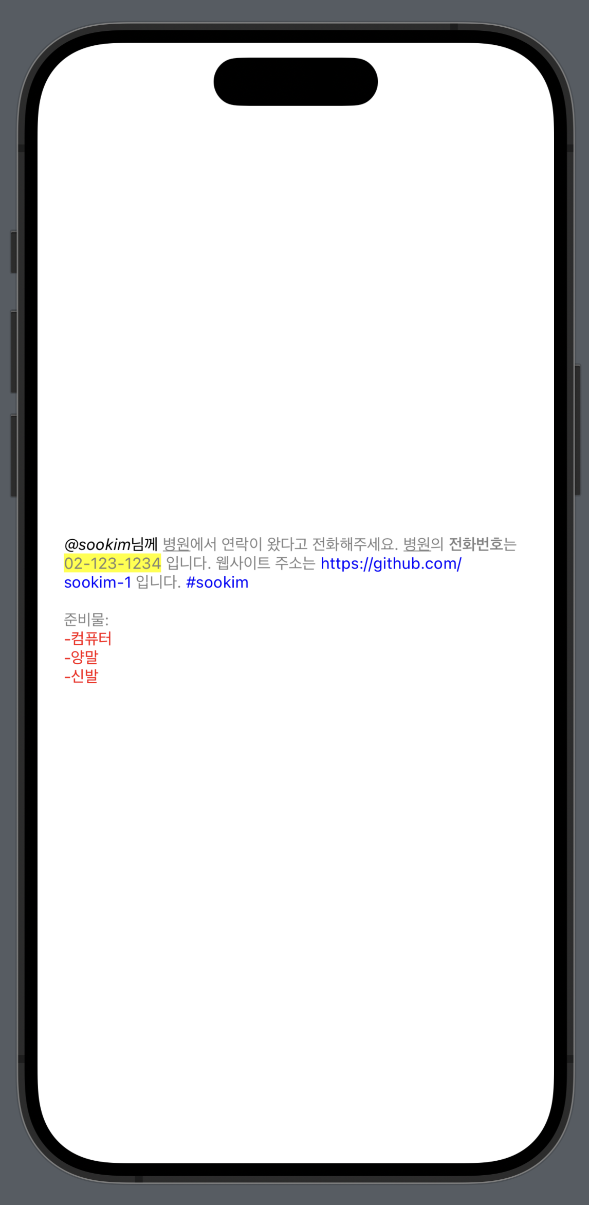 - 해쉬태그(#), 멘션(@), 링크, 전화번호등을 감지하고 스타일을 적용할 수 있습니다.