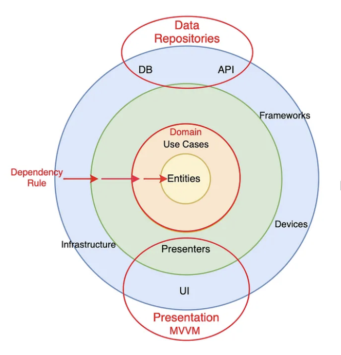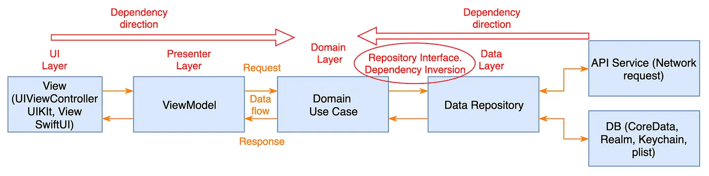 <์ด๋ฏธ์ง ์ถ์ฒ : https://tech.olx.com/clean-architecture-and-mvvm-on-ios-c9d167d9f5b3>